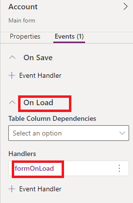 #9. Select form > "Events" > "+ Event Handler" and input a handler name which is "formOnLoad"