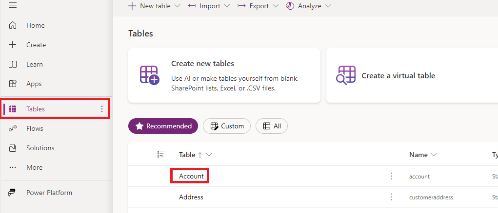 #2. Select "Tables" on the left menu pane then select "Accounts" on the main pane