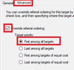 - In "Advanced" tab, check "Override referral ordering" then chose "First among all targets"