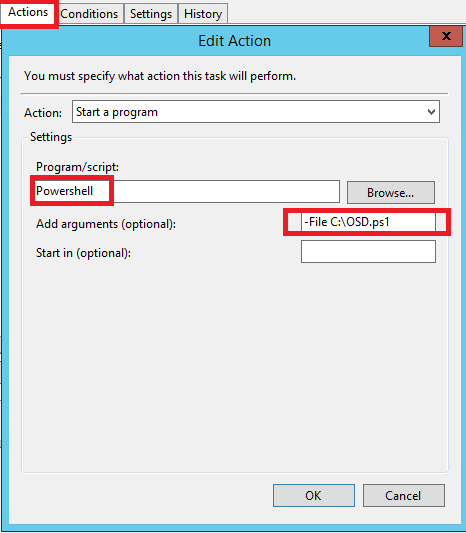 In action tab, set to run PowerShell and specify the path of PowerShell script with input parameter "-file"